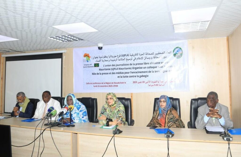 Le 24 novembre 2025, l’Union des Journalistes de la Presse Libre Africaine – section Mauritanie (UJPLA Mauritanie) a organisé un colloque placé sous le thème : « Le rôle des journalistes dans la lutte contre la corruption et l’enracinement de la bonne gouvernance ».