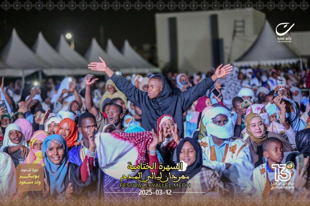 La 13 eme édition du Festival «leyaali El Medh» (chants de louanges du Prophète, PSL), organisée par le centre Teranim pour les arts populaires, a pris fin le 14 mars dernier. Cette 14eme Edition, parrainée par la Première Dame Marieme Mohamed Fadel Dah, s’est déroulée au stade Cheikha Boidiya de Nouakchott. Pendant trois nuits, des milliers de nouakchottois ont veillé tard dans la nuit à l’écoute des medaha (chanteurs de medh.).